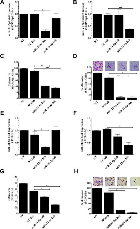 Figure 3: Colony formation and invasion assays in SKOV3ip1 and PC3 cells. (A) miR-21-5p and (B) miR-21-3p qPCR expression following miR-21-5p-Inh and miR-21-3p-Inh transfection in SKOV3ip1 cells, respectively. (C) Colony formation and (D) invasion assays in miR-21-5p-Inh and miR-21-3p-Inh transfected SKOV3ip1 cells. (E) miR-21-5p and (F) miR-21-3p qPCR expression profiling following miR-21-5p-Inh and miR-21-3p-Inh transfection in PC3 cells, respectively. (G) Colony formation assays and (H) invasion assays in miR-21-5p-Inh and miR-21-3p-Inh transfected PC3 cells. Experiments were performed at least in triplicates. Columns represent the means ± SEM. *p ≤ 0.05, **p ≤ 0.01, and ***p ≤ 0.001.