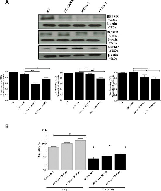 Figure 6: SiRNA-mediated gene silencing. A2780 cells were transfected with 2 siRNAs for each: RBPMS, RCBTB1 or ZNF608 of with a NC-siRNA. (A) Western blots and densitometric analysis of the band intensities of RBPMS, RCBTB1, and ZNF608 protein levels after silencing with the siRNAs. β-actin was used for normalization. (B) Percentage of viable A2780 cells after transfection with siRNA-1-RBPMS or siRNA-2-RBPMS, in the presence or absence of cisplatin (Cis) (1 μM final concentration). Experiments were performed in triplicates. Columns represent the means ± SEM. *p ≤ 0.05, **p ≤ 0.01, and ***p ≤ 0.001.