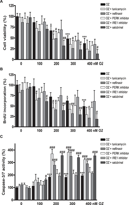 Figure 1: Antiproliferative and pro-apoptotic effects of oprozomib in monotherapy or in combination with modulators of ER stress in human hepatoma HepG2 cells. (A) MTT assay (B) BrdU incorporation (C) Caspase-3/7 activity. OZ: oprozomib. *p < 0.05, **p < 0.01, ***p < 0.001 compared to oprozomib 0 nM; #p < 0.05, ##p < 0.01, ###p < 0.001 compared to the respective concentration of oprozomib alone. Results are representative of 2 independent experiments.