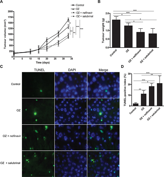 Secondly, the effect of OZ was assessed in a HepG2 xenograft model. No significant differences in body weight or appearance between control and OZ-treated animals were observed during the course of the xenograft study (data not shown). OZ administration suppressed the growth rate of the HepG2-derived tumors (p < 0.05, Figure 4A). Accordingly, TUNEL immunofluorescence demonstrated a significant increase of TUNEL-positive apoptotic HepG2 cells following OZ administration (p < 0.01, Figure 4C–4D).