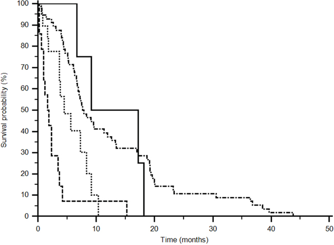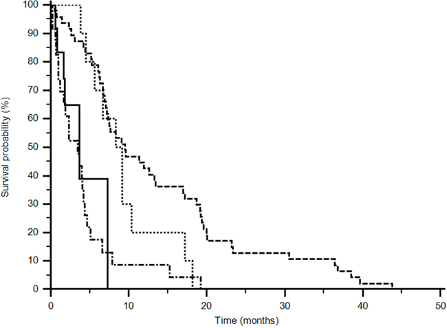 For statistical analysis, overall survival (OS) and progression free survival (PFS) were defined as the interval between the date of beginning of first-line treatment to death or last follow-up visit, and to clinical progression or death or last follow-up visit if not progressed.