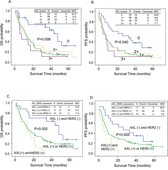 HER2-targeted agents, including trastuzumab and lapatinib, are a promising targeted therapy, especially in treating breast cancer. Over-expression of AXL has been shown to be a novel mechanism of acquired resistance to HER2-targeted agents in lapatinib-resistant, HER2-positive breast cancer clones [26]. Foretinib (XL880, GSK1363089), an oral multi-kinase inhibitor acting on AXL, c-Met, RON and VEGFR-2, can restore sensitivities to lapatinib and trastuzumab in resistant cells [26]. Synergistic effects of foretinib with HER-targets have been demonstrated in MET and HER1/2 co-activated cells [27]. Meanwhile, the AXL inhibitor BMS777607 and HER2 inhibitor lapatinib exhibit a synergistic cytotoxic effect in breast and ovarian cancer cells [28]. However, the prognostic role of co-expression of AXL and HER2 in cancer cells has hardly been investigated.