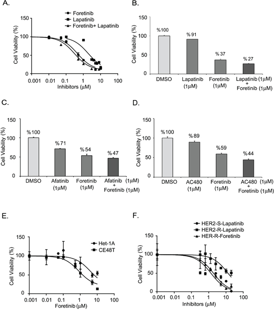 The CE48T/VGH cells, lapatinib-resistant sub-cells and Het-1A cells were plated on 96-well plates (8000 cells/well) and treated with the indicated amounts of AXL inhibitor, foretinib [37] (GSK1363089, provided by Santa Cruz Biotechnology, Inc. SC-364492) or HER2 inhibitors. The HER2 inhibitors included lapatinib, afatinib [38] (Tovok, provided by Boehringer Ingelheim, Taiwan), and AC480 [39] (BMS599626, synthesized by Selleckchem, S1056). After incubation for 72 hours, cell survival was determined by MTT assay as described previously [40–41].