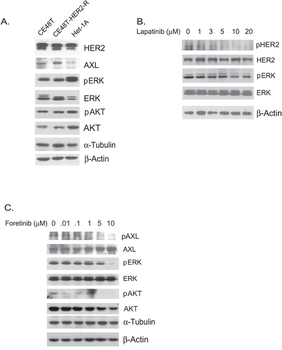 To detect protein expression in the esophageal cells, total protein was extracted from the cells by RIPA buffer (150 mM NaCl, 50 mM Tris–HCl [pH 7.5], 1 % Igepal-CA630, 0.5 % sodium deoxycholate, 0.1 % SDS, 50 mM NaF, 1 mM Na3VaO4, and complete protease inhibitor cocktail). Protein expression was analyzed by SDS-PAGE and western blotting with specific antibodies as described previously [40–41]. The primary antibodies for protein detection were anti-AXL rabbit polyclonal antibody (pAb) (ab72069, Abcam), anti-phospho-AXL (Tyr702, D12B2) rabbit monoclonal antibody (mAb) (#5724, Cell Signaling Technology), anti-HER2 rabbit antibody (#2242, Cell signaling), anti-phospho -HER2/ErbB2 (Tyr1221/1222, 6B12) pAb (#2243, Cell Signaling Technology), anti-Actin mAb (clone C4, Millipore), anti-ERK 1 (K-23) (Santa Cruz), anti-phospho-p44/42 Erk1/2 (Thr202/Tyr204) mAb (#4370, Cell Signaling Technology), anti-Akt antibody (#9272, Cell Signaling Technology), anti-phospho-Akt (Ser473) (#9271, Cell Signaling Technology), and anti-α-Tubulin (DM1A, Abcam).
