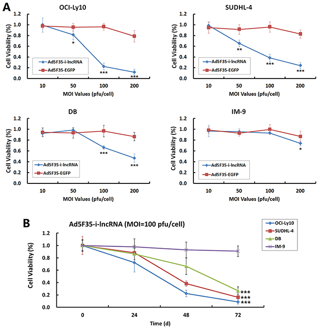 Figure 2: Inhibitory effect of i-lncRNA on cell proliferation. A. The four cell lines were planted in 96-well plates at a density of 1 × 104 cells/100 μL/well. After cultured for 24 h, the viruses Ad5F35-i-lncRNA and Ad5F35-EGFP were added at MOIs of 10 to 200 pfu/cell in a volume of 100 μL/well. Cells were continuously cultured for 48 h followed by CCK-8 assay analysis. A microplate reader was used to measure the optical density (OD) of each well at 490 nm, the data were used to plot cell viability curves; *P<0.05, **P<0.01 and ***P<0.001 compared with the Ad5F35-EGFP-infected group at the same MOI value. B. Cells were infected with Ad5F35-i-lncRNA at an MOI of 100 pfu/cell and cultured for 24 h, 48 h, and 72 h. The cell viability was measured as aforementioned; ***P<0.001 compared with IM-9 cells.