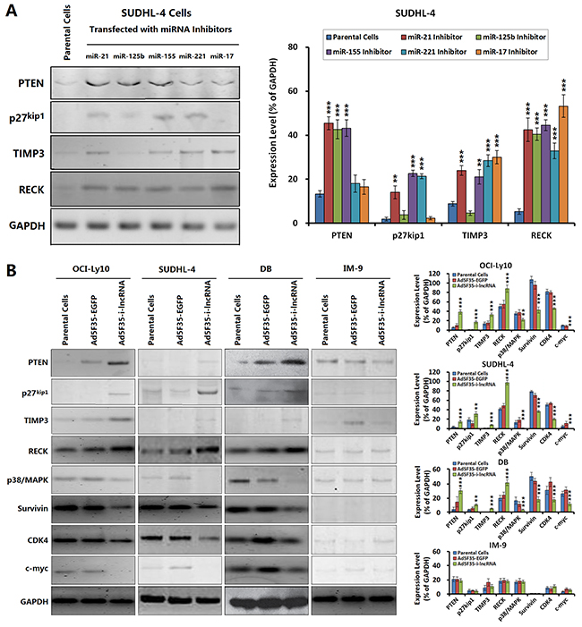 Figure 4: Changes of OncomiR target gene expression mediated by i-lncRNA. A. SUDHL-4 cells were seeded into 24-well plates at a density of 1×106 cells/100 μL/well and incubated with the indicated miRNA inhibitors at a concentration of 100 nmol/L for 48 h, the harvested cells were managed to detect the expressions of OncomiR target genes. GAPDH was used as the loading control. The densitometry analysis of every protein was performed, normalized with GAPDH content; **P<0.01 and ***P<0.001 compared with the corresponding parental cells. B. The four cell lines were planted in 24-well plates at a density of 1×10 6 cells/100 μL/well for 24 h, then infected with Ad5F35-i-lncRNA or Ad5F35-EGFP at an MOI of 100 pfu/cell. After continuously cultured for 48 h, cells were harvested for isolation of total proteins, and the expressions of the indicated proteins were examined by Western blot. The densitometry analysis of every protein was performed, normalized with GAPDH content; **P<0.01 and ***P<0.001 compared with the corresponding parental cells.