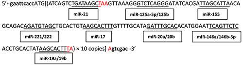 Intracellular miRNAs bind to the messenger RNAs (mRNAs) of target genes with complementary sequences to induce mRNA degradation or inhibit mRNA translation, thereby exerting their role as post-transcriptional regulators of target genes [21]. Based on the mechanisms of miRNA functions, we selected those that are highly expressed in DLBCL, including miR-21, miR-155, miR-221/222, miR-125a-5p/125b, and miR-146a/146b-5p, as well as the miR-17-92 family members miR-17, miR-19a/19b, and miR-20a/20b; subsequently, we generated tandem sequences of 10 copies of the antisense sequences to these miRNA seed sequences and synthesized an interfering long non-coding RNA (i-lncRNA). This i-lncRNA contained multiple repeat sequences capable of binding to the OncomiRs aforementioned; accordingly, the i-lncRNA would compete with the corresponding mRNAs of target genes for OncomiR binding, thereby effectively consuming a large amount of OncomiRs in the cells. This process would interfere with many OncomiRs by protecting the targeted tumor suppressor genes and promoting anti-tumor effects. This treatment strategy would specifically target the carcinogenic effects of many OncomiRs that are usually not expressed in normal cells. Therefore, such a treatment strategy could improve anti-tumor efficacy and safety and is a good prospect for clinical applications.