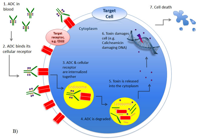 Figure 2: Composition and mode of action of antibody-drug-conjugates (ADC). A) An ADC is composed of a monoclonal antibody directed against a specific epitope on a target cell. A cytotoxic compound is attached to the antibody via a linker. B) Once administered, the antibody component of the ADC binds to the targeted cell receptor, which enables the ADC to be internalized (usually via endocytosis) and subsequently degraded. The released toxin causes cell death via various mechanisms depending on the toxin, such as DNA damage or inhibiting protein translation.