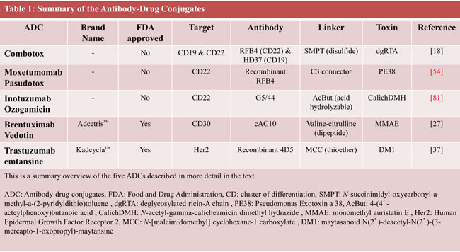 In general, ADCs comprise three components: they are made up of a monoclonal antibody (mAb) conjugated to a toxin via a chemical linker. The mAb allows targeted delivery of a potent cell toxin to specific malignant cells, thereby maximizing drug delivery while limiting bystander effects of traditional cytotoxic agents (Figure 2). In the last few years, it has become apparent that determining the perfect linker may be just as important as the other components of an ADC in increasing efficacy and decreasing toxicity.[7-9] This review describes in detail the development of five unique ADCs, each using a different combination of linker technology and toxin. These examples demonstrate that various components of an ADC are equally important in determining its efficacy and relative safety (Table 1).[10-13]