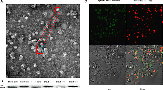 Figure 1: Identification of Skov3 secreted exosomes and internalization of the exosomes into recipient cells. (A) Representative TEM micrograph of exosomes derived from Skov3 cells. (B) Immunoblot of CD63 in exosomes derived from Skov3 cells. (C) Unlabeled macrophages were incubated with Skov3-derived exosomes that were labeled with D384 and SytoRNA. The differential interference contrast (DIC) presented the morphology of macrophages which were not fluorescent. Data exhibits typical image of 3 independent experiments.