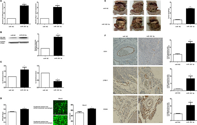 Figure 5: MiR-222-3p promotes M2 phenotype polarization of macrophages in vitro and vivo, which can enhance growth and metastasis of EOC cells. Macrophages were transfected with the miR-222-3p mimic and compared with a negative control. (A) After 24 hours, qRT-PCR was applied using primers for CD206 and Arg-1. (B) After 48 hours, the expression of M2 surface marker CD206 was detected by western blot. (C) Cytokine levels in the media of macrophages. (D) Proliferation and migration capacity of the human EOC cell line Skov3 which incubated with the supernatants of macrophages treated with miR-222-3p or miR-negative control was performed using MTS and Transwell assay. (E) Images of appearance of tumour deposits at necropsy of miR-222-3p group compared with miR-NC group in vivo. (F) Representative images of CD31, LYVE-1 and CD206 immunostaining are shown in tumor tissues of miR-222-3p group or miR-NC group; scale bar = 50 μm. CD31 positive ‘hotspots’, LYVE-1 positive ‘hotspots’ and CD206-positive cells were calculated as number of positive cells. Data are shown as mean ± SEM, n = 3 independent experiments; *p < 0.05, **p < 0.01, and ***p < 0.001 compared with the miR-NC treatments.
