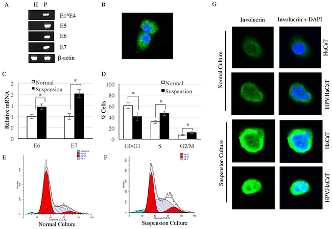 Figure 1: HPV11 early genes were identified in HPV11.HaCaT cells, but not HaCaT cells. A. HPV11 early genes were only expressed in HPV11.HaCaT cells, while β-actin were expressed in both cells. B. Immunofluorescence showed E7 protein was expressed in HPV11.HaCaT cells. Green fluorescence indicated E7 protein and blue fluorescence indicated cell nucleus. C. The expression of E6 and E7 genes were increased significantly in suspension culture HPV11.HaCaT cells comparing to normal culture. D–F. In suspension culture HPV11.HaCaT cells, the proportion of cells in G2/M and S phases is significantly increased. G. The expression of involucrin is significantly increased in suspesion cultured of both HPV11.HaCaT and HaCaT cells, comparing with normal culture. Data are means ± SD from three independent experiments. H refers to HaCaT cells and P refers to HPV11.HaCaT cells.
