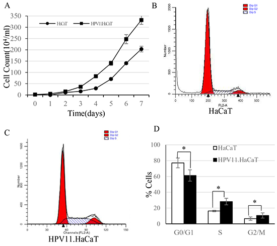 Figure 2: The cell growth curves and FACS analysis of HaCaT and HPV11.HaCaT cells. A. Cell growth curve showed that HPV gene could promote the host cells’ proliferation. From the 3rd day, HPV11. HaCaT proliferated more rapidly than HaCaT (P<0.05). B–D. Cell cycle analysis in HaCaT and HPV11.HaCaT cells. In HPV11.HaCaT cells, there is a significant increase in the proportion of cells in G2/M and S phases (G1: HPV11.HaCaT<HaCaT, P<0.01; G2: HPV>HaCaT, P<0.05; S: HPV>HaCaT, P<0.01).