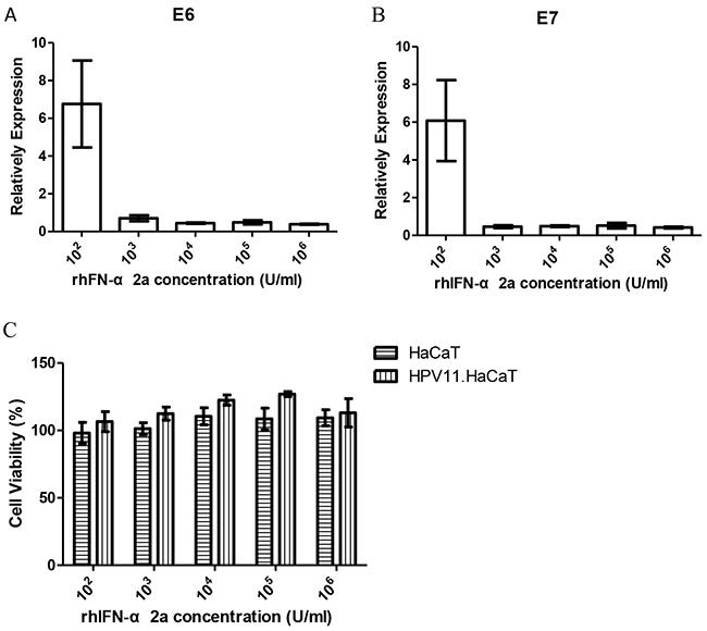 Figure 4: Gene expression difference and cell viability HPV11.HaCaT cells with dose dependent rhIFN-α 2a treatment for 24h. A&B. After treated for 24h, 1000U/ml or higher concentration rhIFN-α 2a could significantly decrease the expression of HPV11 E6 and E7 mRNA (P<0.05). Data are means ± SD from three independent experiments. C. Cell viability did not change significantly with the different concentration of rhIFN-α 2a concentration.