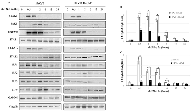Figure 5: The suppression of JAK-STAT signaling pathway in HPV11.HaCaT Cell line. A. Western blotting analysis of HaCat and HPV11.HaCaT Cells after rhIFN-α 2a treatment (1000U/ml). B. pSTAT1 was significantly decreased in HPV11.HaCaT Cells after IFN-α treatment for 0.5 to 2 hours. C. pSTAT2 was significantly decreased in HPV11.HaCaT Cells after rhIFN-α 2a treatment for 0.5 to 2 hours. Data are means ± SD from three independent experiments.