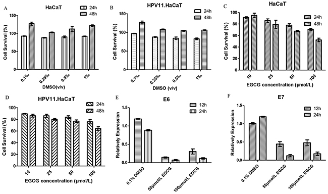 Figure 6: The anti-HPV effect of EGCG in HPV11.HaCaT cells. A&B. DMSO treatment showed no cytotoxicity for HaCat and HPV11.HaCaT Cells. C&D. EGCG treatment affects cell viability for HaCat and HPV11.HaCaT Cells. But cell survival was more than 80% in both cells in 24h. High concentration (100μmol/L) EGCG showed significant inhibition on cells proliferation in 48h as the cell survival decreasing to 60%. E&F. After treated for 12 or 24 hours, 50μmol/L and 100μmol/L EGCG could significantly decrease the expression of HPV11 E6 and E7 mRNA (P<0.05), while DMSO as solvent didn’t show an ability to decrease HPV11 E6 and E7 mRNA expression. Data are means ± SD from three independent experiments.