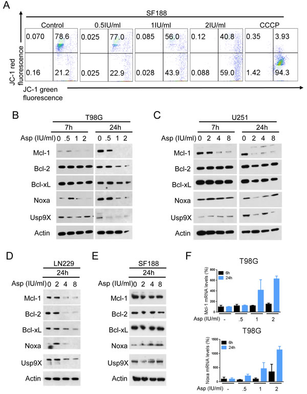 Figure 2: L-asparaginase (Asp) treatment reduces the mitochondrial membrane potential and expression of anti-apoptotic Bcl-2 family proteins. A., Representative flow plots of SF188 glioblastoma cells treated with increasing concentrations of L-asparaginase prior to staining for JC-1 and flow cytometric analysis. Treatment with the mitochondrial uncoupler carbonyl cyanide 3-chlorophenylhydrazone (CCCP) served as positive control. B.-E., T98G (B), U251 (C), LN229 (D) and SF188 (E) glioblastoma cells were treated as indicated with L-asparaginase under serum starvation (1.5% FBS). Whole-cell extracts were examined by Western blot for Mcl-1, Bcl-2, Bcl-xL, Noxa and Usp9X. Actin served as a loading control. F., T98G glioblastoma cells were treated for 6 or 24h with increasing concentrations of L-asparaginase prior to performing rtPCR for Mcl-1 and Noxa. Columns, mean. Bars, SD.
