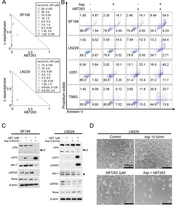 Figure 3: Combined treatment with L-asparaginase (Asp) and ABT263 results in anti-proliferative and pro-apoptotic synergism. A., SF188 and LN299 glioblastoma cells were treated for 72h with L-asparaginase and ABT263 as indicated prior to performing MTT-assays. Normalized isobolograms were calculated using the CompuSyn software. The connecting line represents additivity. Data points located below the line indicate a synergistic drug-drug interaction and data points above the line indicate an antagonistic drug-drug interaction. B., Representative flow plots of SF188 (Asp 0.5IU/ml, ABT263 1μM, 24h), LN229 (Asp 2IU/ml, ABT263 0.5μM, 24h), U251 (Asp 2IU/ml, ABT263 1.5μM, 24h) and T98G (Asp 1IU/ml, ABT263 1μM, 48h) glioblastoma cells subjected to treatment with L-asparaginase, ABT263 or the combination prior to staining for annexin V/propidium iodide and flow cytometric analysis. C., SF188 and LN229 glioblastoma cells were treated with L-asparaginase and/or ABT263 as indicated. Western blot analysis was performed for caspase 9 (CP9), cleaved caspase 3 (cCP3), cleaved PARP (cPARP), Mcl-1, Usp9X and Noxa. Actin expression was determined to confirm equal protein loading. CF = cleaved fragment; arrow head represents specific band for Mcl-1. D., Representative microphotographs of LN229 glioblastoma cells treated with 10 IU/ml L-asparaginase, 2 μM ABT263 or the combination for 48h. Magnification, x40; scale bar, 100 μm..