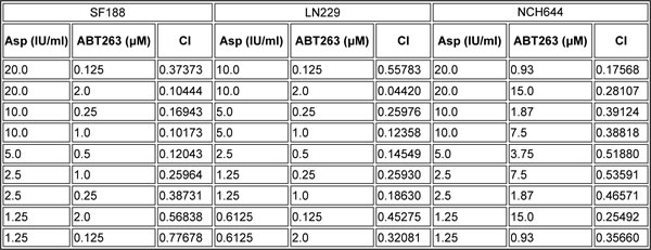 Table 1: Combined treatment with ABT263 and L-asparaginase (Asp) results in a synergistic anti-proliferative effect in SF188, LN229 and NCH644 glioblastoma cells.