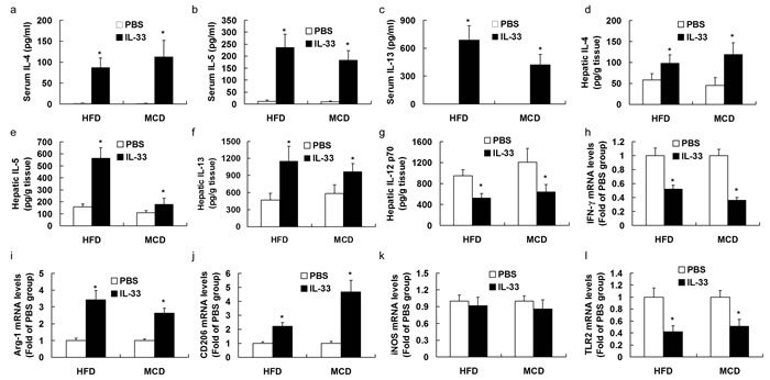 Figure 5: Mice were exposed to HFD or MCD, and treated with recombinant IL-33 or PBS. Graphs showed the serum levels of IL-4 a., IL-5 b., and IL-13 c., hepatic protein levels of IL-4 d., IL-5 e., IL-13 f., and IL-12 p70 g., and mRNA levels of IFN-γ h., Arg-1 i., CD206 j., TLR2 k., and iNOS l.. n = 8-10 in each group. Values are means ± SD; * p < 0.05 versus PBS-treated group.