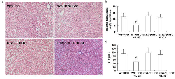 Figure 8: ST2 knockout mice and wild-type mice were fed with HFD, and treated with recombinant IL-33. Paraffin-embedded liver sections were stained with hematoxylin-eosin for evaluation of steatohepatitis a.. Graphs showed hepatic triglyceride b. and serum ALT levels c. in mice. n = 8-10 in each group. Values are means ± SD; # p < 0.05 versus wild-type mice fed with HFD diet.