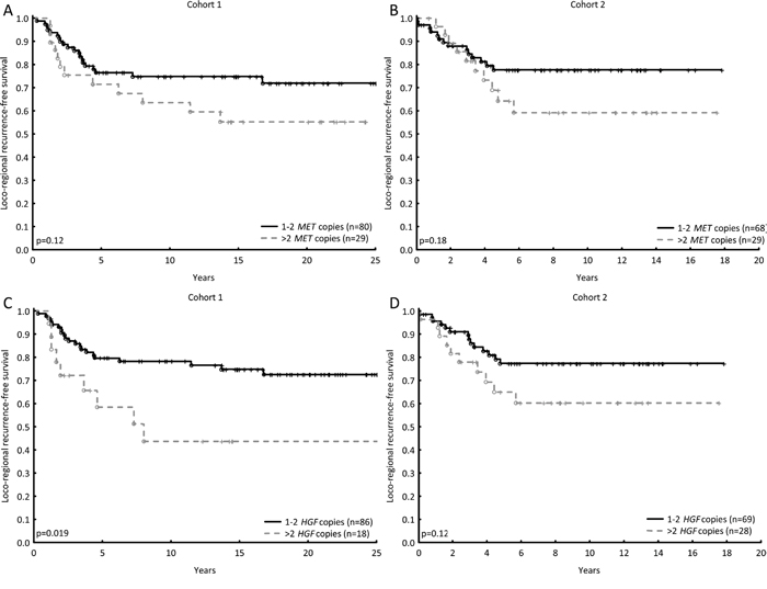 Patient survival in multiple groups was computed with Kaplan-Meier and the log-rank test was carried out to estimate statistical differences. Survival time for the given end point was defined as the period of time elapsed between the diagnosis of the primary tumour and the distant recurrence (DRFS) or loco-regional recurrence (loco-regional recurrence-free survival). The Hazard Ratio was calculated using the Cox proportional hazard regression model and Pearson’s chi-squared test was executed to assess the relationships between the different variables. A multivariate Cox model was used to test the interaction between benefit from post-operative radiotherapy versus chemotherapy and MET or HGF copy numbers, pAkt, pMet, Met or HGF protein expression. Multivariate Cox models were also used in the analysis of DRFS in relation to MET amplification and known prognostic factors, stratified for cohort.