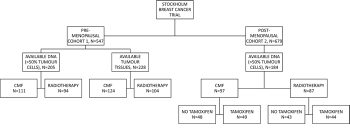 From 1976 to 1990, 547 pre-menopausal and 679 post-menopausal women with breast cancer in the Stockholm region were randomised to adjuvant chemotherapy or post-operative radiotherapy [34]. The post-menopausal patients were furthermore randomised to tamoxifen therapy or no adjuvant endocrine treatment, with a duration of two years. From 1983, most patients who received tamoxifen, and were disease-free for two years, were randomly assigned to stop tamoxifen treatment or to continue for three more years. Patients had either histologically verified lymph node metastasis or a tumour diameter surpassing 30 mm. Patients who received post-operative radiotherapy were given a total dose of 46 Gy, with 2 Gy per fraction for 5 days per week, targeted towards the chest wall, axilla, supraclavicular fossa, and the ipsilateral internal mammary nodes. Chemotherapy was given according to the Milan trial protocol, consisting of 12 courses of CMF (cyclophosphamide 100 mg/m2, orally once a day, methotrexate 40 mg/m2, intravenous on days 1 and 8, 5-fluorouracil 600 mg/m2 intravenous on days 1 and 8) [35]. Modified radical mastectomy was performed as primary surgery. Fresh frozen tissues were stored in liquid nitrogen and formalin fixed paraffin embedded (FFPE) tissues were stored at room temperature. The present study includes patients from the two cohorts originated from this trial: cohort 1 exists of pre-menopausal patients and cohort 2 of post-menopausal patients. Tumour tissue material in the form of tissue microarrays (TMA) was still available from 228 pre-menopausal patients in cohort 1 and 205 DNA samples extracted from FFPE tissue. Cohort 2 consists of 184 DNA samples extracted from frozen tumour tissue (Figure 4). All DNA samples were extracted from tumour tissue samples containing at least 50% tumour cells. DNA was stored at -70°C and during experiments at -20°C. Tumour tissue materials from cohort 1 were stored in the form of freshly cut tissue microarrays at 4°C with an extra thick layer of paraffin to reduce oxidation. Retrospective studies on archived tumour tissue, with the purpose to evaluate prognostic and treatment predicting factors, were approved by the ethics committee at Karolinska Institute in Stockholm, Sweden. The REMARK guidelines were followed in regard to the design and reportage of this study [36]. Tables 1 and 2 show the tumour and treatment characteristics of the patients included in this study. ER status in both cohorts was previously analysed by isoelectric focusing; the threshold for ER positivity was 0.05 fmol/μg DNA [37]. HER2 overexpression in cohort 1 was previously measured by immunohistochemistry (IHC), according to Herceptest Guidelines for membrane staining (Dako, Glostrup, Denmark). In cohort 2, HER2 protein expression was previously measured by flow cytometry [33]. Phospho-Akt-S473 was previously determined in cohort 2 by IHC [33]. Nottingham grade (NHG) was only available in cohort 1, S-phase fraction (SPF) was used to estimate proliferation status of the tumours in cohort 2 [38].