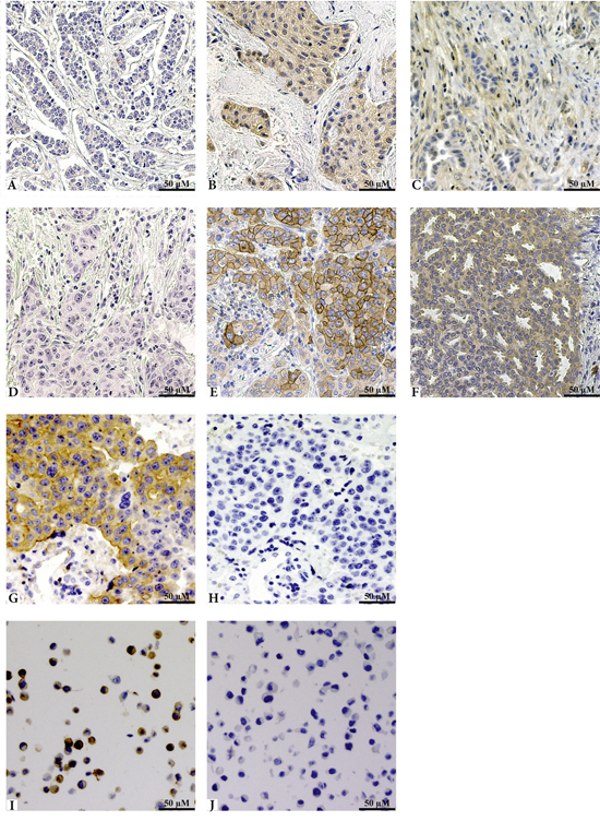 Figure 5: Representative images of IHC staining of HGF, pMet and the phospho-specific antibody validation. Panels A through C show staining of HGF, where A represents negative tissue, B cytoplasmic staining of the tumour cells, and C positive staining of the stroma. Panels D to F show staining patterns of the pMet antibody and are even representative for the total Met antibody. Both antibodies showed similar staining and were graded identically. Panel D shows negative tissue, E represents membranous expression, and F cytoplasmic staining. G and H show staining with the pMet antibody, without and with Lambda phosphatase, respectively. Untreated MKN45 cells are shown in panel I and SU11274 treated MKN45 cells are shown in panel J, both stained with pMet.