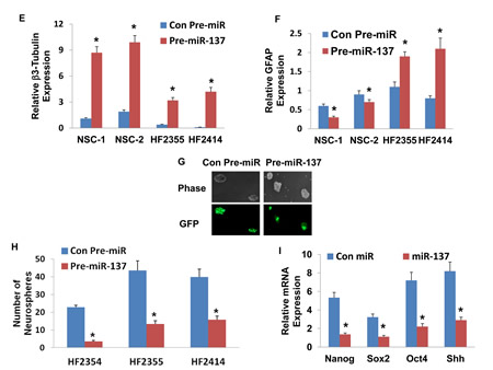Figure 2: Roles of miR-137 in NSC and GSC differentiation, GSC self-renewal and stemness markers. Two NSCs (A) and GSCs (HF2355 and HF2414) (B) were maintained as neurospheres or were induced to differentiate by plating them on laminin in NM medium. The expression of β3-tubulin (A,B), GFAP (A,B) and miR-137 (C) was determined after 10 days of treatment using real-time PCR. NSCs (NSC-1 and NSC-2) and GSCs (HF2355 and HF2414) were transduced with a lentivirus vector expressing pre-miR-137-GFP or control pre-miR-GFP. After 1 week the transduction efficacy in the neurospheres was determined using real-time PCR analysis (D) and fluorescence microscopy (G). The differentiation of the NSCs (E,F) and the GSCs (F,F) was determined by analyzing the expression of β3-tubulin (E) and GFAP (F) using real-time PCR. Self-renewal assay was performed 14 days post transduction as described in the methods (H). The expression of the stemness markers, Nanog, Sox2, Oct4 and Shh was determined in GSCs expressing pre-miR-137 or control pre-miR using real-time PCR (I). The results are representative of three different experiments that gave similar results (G) or are the mean ± SE of three different experiments.*P<0.05.