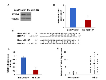 Figure 3: RTVP-1 is a novel target of miR-137. The HF2354 GSCs were transduced with a lentivirus vector expressing pre-miR-137 or a Con-pre-miR. The expression of RTVP-1 was determined using Western blot analysis (A) and real-time PCR (B). Sequence alignment of RTVP-1 3’-UTR and miR-137. Target sites of miR-137 in the RTVP-1 3’-UTR were analyzed using miRwalk and Targetscan (C). U87 glioma cells were transfected with a RTVP-1 3’-UTR -luciferase plasmid followed by transfection with a miR-137 mimic or a control miR. The luciferase activity of the cells was determined after 48 h (D). The expression of RTVP-1 was determined in GBM and normal brain specimens using real-time PCR. Data from individual human tissues are presented with the median and interquartile range noted. Age adjusted t-test, P < 0.001 (E). The results are representative of three different experiments that gave similar results (A) or are the mean ± SE of three different experiments (B,D).*P<0.001.