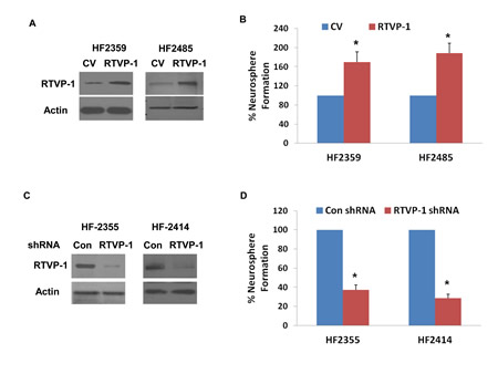 We then examined the role of RTVP-1 in the self-renewal ability of GSCs. We used two GSCs, HF2359 and HF2485, which express low level of endogenous RTVP-1 and transduced them with a lentivirus vector expressing RTVP-1 that increased the expression of the RTVP-1 protein in these cells (Figure 4A). The transduction of both HF2359 and HF2485 GSCs with RTVP-1 significantly increased the self-renewal of these cells by 1.6-fold and 2-fold, respectively, compared to GSCs that were transduced with a control lentivirus vector (Figure 4B). We then examined the effect of RTVP-1 silencing on the self-renewal of the HF2355 and HF2414 GSCs that express high levels of this protein. Transduction of the GSCs with lentivirus vectors expressing shRNAs targeting RTVP-1 decreased the expression of this protein (Figure 4C) and inhibited the self-renewal of the transduced GSCs by 2.9-fold and 3.7-fold, respectively, compared with GSCs that were transduced with a lentivirus vector expressing a control shRNA (Figure 4D).