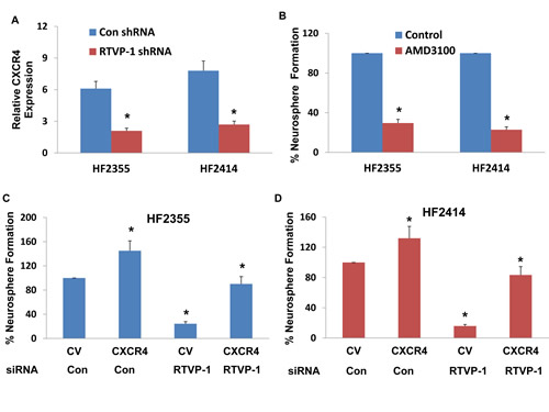 Here, we examined the expression of miR-137 in glial tumors and GSCs and its role in self-renewal and differentiation of these cells. In addition, we identified RTVP-1 as a novel target of miR-137 and demonstrated its effects on the self-renewal of GSCs downstream of miR-137 and upstream of CXCR4.
