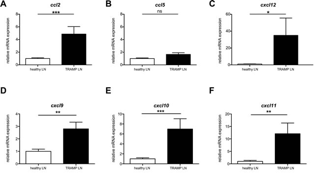 Figure 1: Ccl2 mRNA is differentially upregulated in TRAMP metastatic lymph nodes. A: Ccl2 mRNA relative expression in TRAMP SV40+ or healthy lymph nodes; Mann Whitney test: (***) P<0.001. B: Ccl5 mRNA relative expression in TRAMP SV40+ or healthy lymph nodes; Mann Whitney test: (ns) P>0.05. C: Cxcl12 mRNA relative expression in TRAMP SV40+ or healthy lymph nodes; Mann Whitney test: (*) P< 0.05. D: Cxcl9 mRNA relative expression in TRAMP SV40+ or healthy lymph nodes; Mann Whitney test: (**) P< 0.01. E: Cxcl10 mRNA relative expression in TRAMP SV40+ or healthy lymph nodes; Mann Whitney test: (***) P< 0.001. F: Cxcl11 mRNA relative expression in TRAMP SV40+ or healthy lymph nodes; Mann Whitney test: (**) P< 0.01.