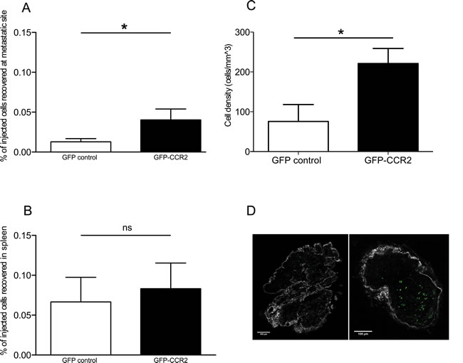 Figure 2: CCR2 transduction significantly improves homing to the metastatic lymph nodes. A: percentage of GFP-CCR2 (n=13) or GFP-control (n=9) injected cells recovered from TRAMP SV40 TAg+ lymph nodes, 24 hours after adoptive transfer, analyzed by FACS; Mann Whitney test: (*) P<0.05. B: percentage of GFP-CCR2 (n=9) or GFP-control (n=10) injected cells, recovered from TRAMP spleens, 24 hours after adoptive transfer, analyzed by FACS; Mann Whitney test: (ns) P>0.05. C: density of GFP-CCR2 (n=4) versus GFP-control (n=6) in TRAMP SV40 TAg+ lymph nodes (cells per mm3), 24 hours after adoptive transfer, analyzed by 2-photon microscopy; unpaired t test: (*) P<0.05 (top). D: Representative images of SV40 TAg+ lymph nodes acquired by 2-photon microscopy. Lymph node from a recipient of GFP-control CD8+ T cells on the left; from a recipient of GFP-CCR2 CD8+ T cells on the right. Green signal indicates GFP+ cells; collagen stain by SHG shown in white.
