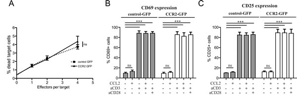Figure 3: Chemokine receptor transduction does not affect killing capacity or activation state of CD8+ T cells. A: Lack of effect of chemokine receptor transduction in in vitro T cell-mediated cytotoxicity. Target (5x104 E.G7-OVA) cells were co-incubated with increasing concentrations of OVA-specific TCR/GFP-control or OVA-specific TCR/GFP-CCR2 transduced CD8+ T cells as effector cells. The target cells were labeled with Orange CMTMR Dye and cell death was assessed by 7-AAD. The percentage of dead target cells was evaluated by flow cytometry; 2-way repeated measures ANOVA: (ns) (P>0.05). B: Lack of costimulatory effects of chemokine ligand on chemokine receptor-transduced CD8+ T cells. CCL2 costimulation assays were performed with GFP-CCR2 or GFP-control-transduced CD8+ T cells. Activation markers CD25 and CD69 were measured by flow cytometry 18h after stimulation. 2-way ANOVA: (***) P<0.001; (ns) P>0.05.