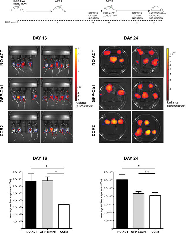 Figure 4: Chemokine receptor-modified CD8+ T cells lead to significant delay in tumor growth. Top: experimental design scheme. Images and plots: (DAY 16) in vivo Integrisense radiance emission detection of implanted E.G7-OVA tumor, 8 days after the first adoptive transfer of CCR2 (n=8) or GFP-control (n=8) transduced cells or no transfer (n=9); 1-way ANOVA and Tukey’s multiple comparison test: (*) P<0.05. (DAY 24) Integrisense radiance emission of harvested E.G7-OVA tumor, 8 days after the second adoptive transfer of CCR2 (n=8) or GFP-control (n=7) transduced cells or no transfer (n=9); 1-way ANOVA and Tukey’s multiple comparison test: (*) P<0.05. Data are displayed as mean + SEM of radiance for each group of animals at a given time point.