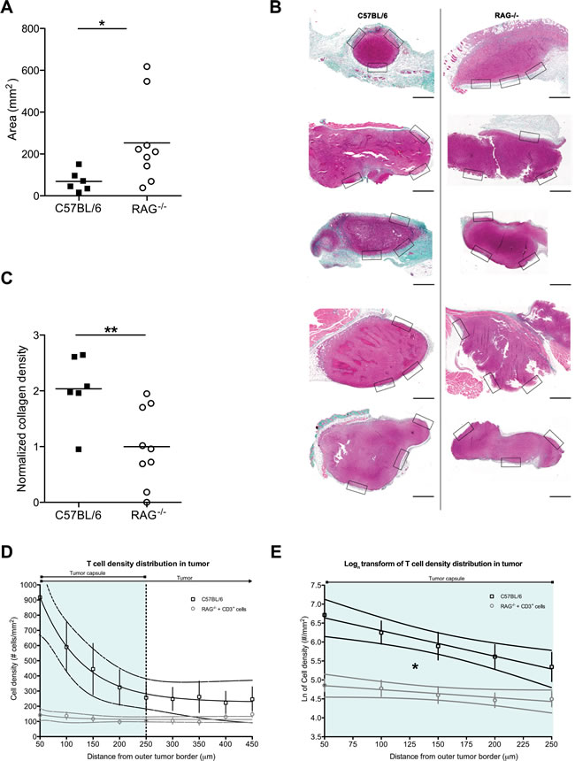 A putatively more ubiquitous presence of fibrosis associated with tumors led us to form a hypothesis as to why such structures may form within diffuse tumors or around solid tumors. Tumors are thought to behave as never-healing wounds [33]. Intriguingly, T cells have been suggested to play an important role in fibrosis formation during wound healing [34], whilst Th2-polarized cells correlate with tumor-promoting inflammation [35]. We thus hypothesized that (host) T cells could be contributing to the formation of tumor-associated fibrosis. To test this, we injected cells from a pancreatic tumor cell line, PANC02, into T and B cell-deficient RAG2-/- mice or wild-type C57BL/6 controls. After 3 weeks of tumor growth, we examined the size of the explanted tumors as well as the formation of a fibrotic capsule around the solid tumors. Unsurprisingly, given the well-characterized role of T cells in immunosurveillance [36], RAG2-/- recipients developed significantly larger tumors than the wild-type recipients (Figure 6A). Surprisingly, however, the tumors in RAG2-/- mice had significantly less dense peri-tumoral collagen than wild-type mouse tumors, as assessed by Masson’s trichrome staining (Figure 6B, 6C), as well as by second harmonic generation in 2-photon microscopy (Supplemental Figure 6). This suggests that T cell presence contributes to the formation of the tumor-associated fibrotic capsule.