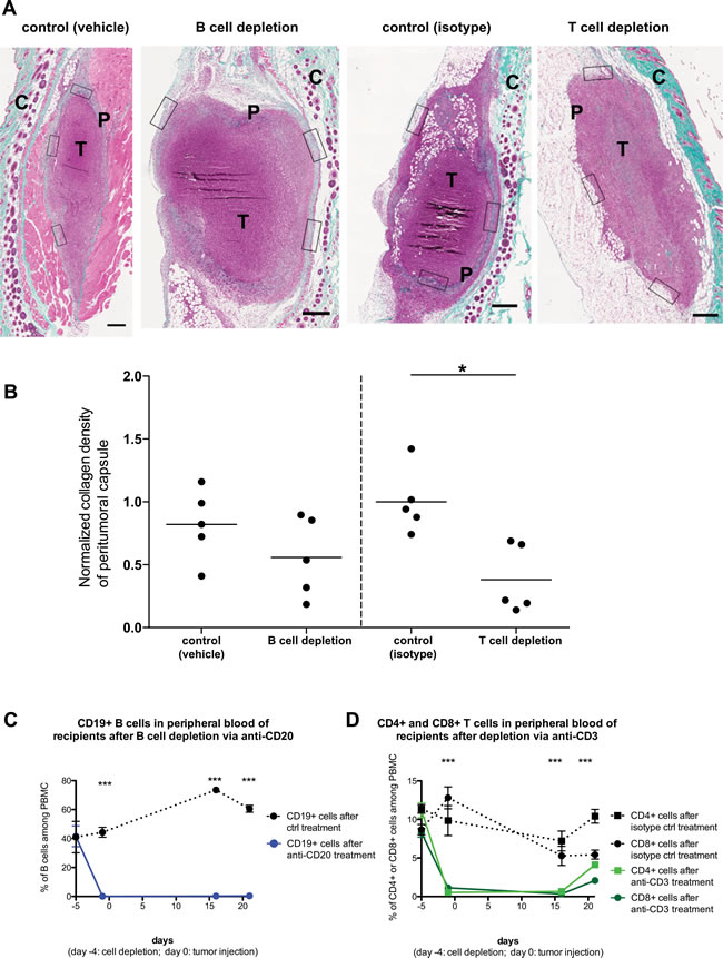 The RAG2-/- mice that we utilized for the above analysis are deficient in both T and B cells. We thus sought to further dissect whether the effects on the peritumoral fibrotic capsule could be attributed to only one of these lymphocyte populations. To achieve this, we depleted the B cells from a cohort of C57BL/6 mice by administering a mouse anti-mouse CD20 antibody, using vehicle (saline) treatment as control. In parallel, we treated another cohort of C57BL/6 with an armenian hamster anti-mouse CD3e antibody (or isotype control), in order to deplete T cells. Four days later, all mice received subcutaneously PANC02 tumor cells, whilst their T and B cell levels were regularly monitored (Figure 7). 3 weeks after tumor injection, we sacrificed all recipients and analyzed the formation of peri-tumoral capsules (Figure 7A, 7B). B cell depletion appeared to slightly reduce capsule formation, yet no significant effect was observed (Figure 7B, left segment). On the other hand, T cell depletion did lead to a significant reduction in collagen deposition in the peritumoral capsule (Figure 7B, right segment). This finding lends further support to our interpretation above, that T cells significantly contribute to the formation of a peritumoral fibrotic capsule. Nonetheless, it would not be prudent to exclude that B cells could also contribute to capsule formation; yet the weak effect observed will require far more extensive studies in order to provide a more definitive answer.
