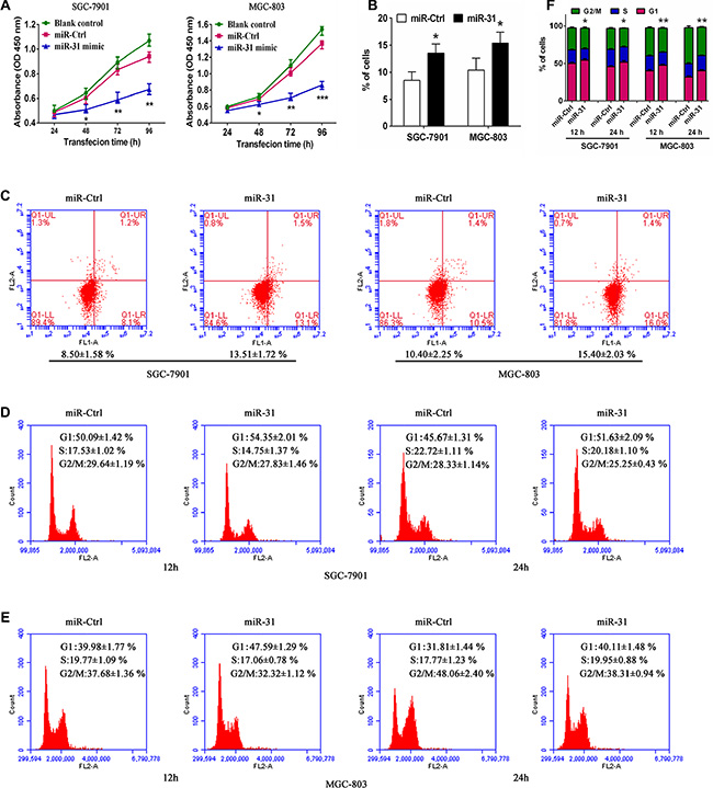 Figure 2: Ectopic expression of miR-31 inhibited tumor cell viability and induced apoptosis and cell-cycle arrest at theG1 phase in SGC-7901 and MGC-803 cells. (A) Cell morphology. Tumor cells were transiently transfected with miRNA negative control ormiR-31 mimic for up to 96 h. (B) Cell viability CCK8 assay. The duplicated cells were then subjected to cell viability CCK8 assay. Data were presented as mean ± sd of three independent experiments. *p < 0.05, **p < 0.01 and ***p < 0.001. (C) Apoptosis assay. 48 h after transfection, tumor cell apoptosis was assessed to determine rate of early apoptosis of SGC-7901 and MGC-803 cells. Data were presented as mean ± sd of three independent experiments of duplicated samples. *p < 0.05 and **p < 0.01. (D, E, F) Flow cytometric cell cycle distribution assay. Additional culture of 12 and 24 h after 48 h transfection, cells were subjected to flow cytometric analysis of cell cycle distribution in SGC-7901 and MGC-803 cells. Experiments were repeated at least three times with similar results and the data are expressed as mean ± sd. *p < 0.05 and **p < 0.01.