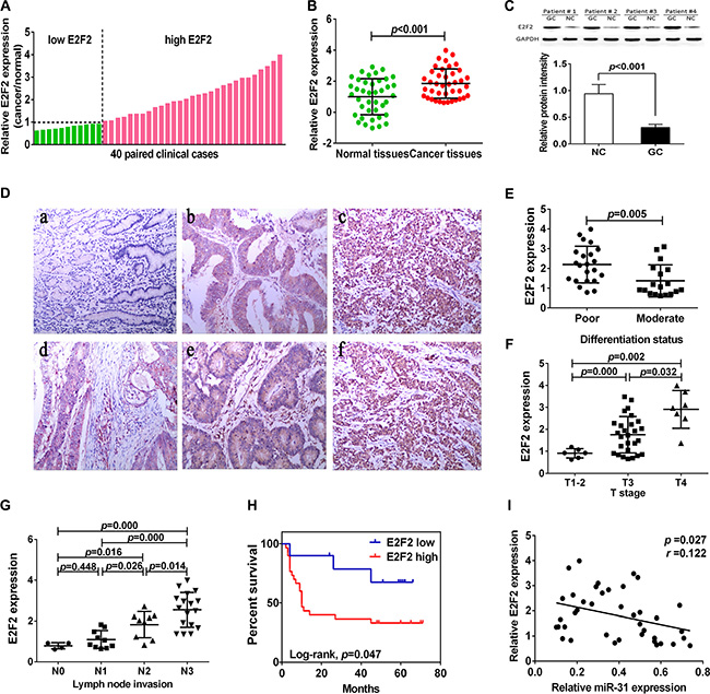 Figure 5: Upregulation of E2F2 expression in gastric cancer tissues. (A, B) qRT-PCR analysis of E2F2 expression in 40 pairs of gastric cancer and corresponding normal tissues. Expression of E2F2 protein was normalized to that of β-actin. The level of E2F2mRNA was significantly higher than that of the adjacent tissues. (C) Western blot. Level of E2F2 protein was normalized to GAPDH. (D) Immunohistochemistry. E2F2 protein expression in gastric cancer tissues was analyzed by immunohistochemistry. a, normal gastric tissue; b, moderately differentiated gastric adenocarcinoma; c, poor differentiated gastric adenocarcinoma; d, superficial muscular infiltration; e, serosal layer infiltration; f, whole layer infiltration (all ×100). (E) Expression of E2F2 protein in different differentiation status of gastric cancer. (poorly differentiated = 22, moderately differentiated = 18). (F) Expression of E2F2 in different T stage (depth of cancer invasion) of gastric cancer, including T1–2 (mucous and muscular layer) 6 cases, T3 (serosal layer) 27 cases and T4 (whole layer) 7 cases. (G) Expression of E2F2 in different N stage (lymph node metastases) of gastric cancer (N0 = 4, N1 = 10, N2 = 9, N4 = 17). (H) Kaplan-Meier curve of overall survival of gastric cancer patients with high (n = 29) vs. low (n = 11) E2F2 levels (p = 0.047). (I) Comparison of miR-31 with E2F2 level in gastric cancer (r = 0.122, p = 0.027).
