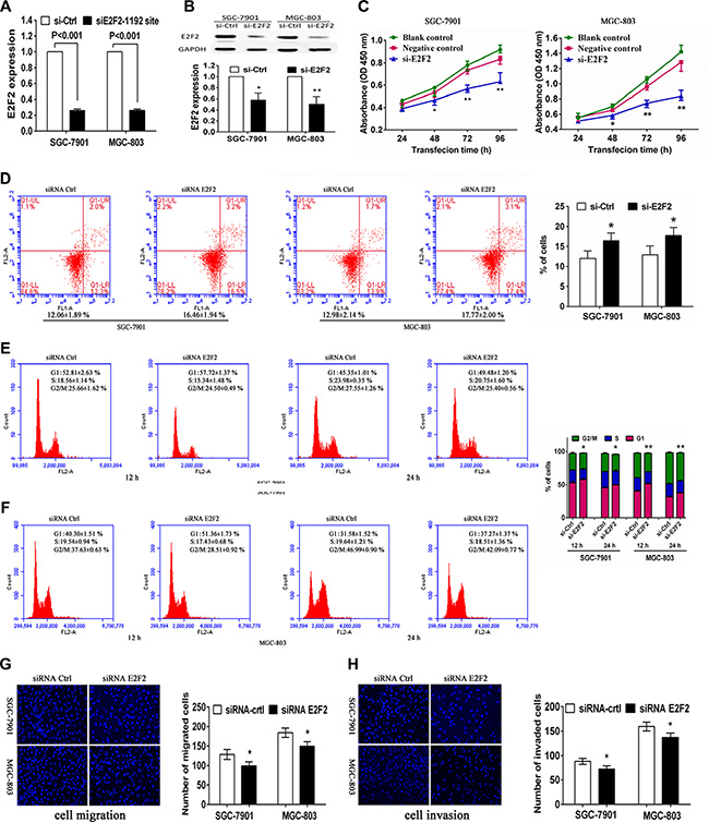 Figure 6: Effects of E2F2 knockdown on gastric cancer SGC-7901 and MGC-803 cells. Tumor cells were transiently transfected with negative control siRNA orE2F2 siRNA and then subjected to different assays. (A) RT-PCR. Level of E2F2 mRNA was assessed by RT-PCR after transfection with negative control or E2F2 siRNA into gastric cancer cells. (B) Western blot. Level of E2F2 protein was assessed after transfection with negative control or E2F2 siRNA into gastric cancer cells. The relative protein levels were normalized to GAPDH and data were presented as mean ± sd. (C) Cell viability CCK8 assay. Cell viability was assessed after 24, 48, 72 and 96 h transfection with negative control or E2F2 siRNA into gastric cancer cells. Data were presented as mean ± sd of three independent experiments. *p < 0.05 and **p < 0.01. (D) Apoptosis assay. Level of apoptosis was assessed after 48 h transfection with negative control or E2F2 siRNA into gastric cancer cells. Data were presented as mean ± sd of three independent experiments with duplicated samples.*p < 0.05 and **p < 0.01. (E, F) Flow cytometric cell cycle assay. Cell cycle distribution was analyzed additional culture of 12 and 24 h after 48 h transfection with negative control or E2F2 siRNA into gastric cancer cells. Experiments were repeated at least three times with similar results and the data were expressed as mean ± sd. *p < 0.05 and **p < 0.01. (G) Tumor cell migration assay. Fluorescent images (×200) (left) and quantification (right) of migration level of SGC-7901 and MGC-803 cells after 24 h transfection with negative control or E2F2 siRNA. (H) Tumor cell invasion assay. Fluorescent images (left) and quantification (right) of invasion level of SGC-7901 and MGC-803 cells after 24 h transfection with negative control or E2F2 siRNA.