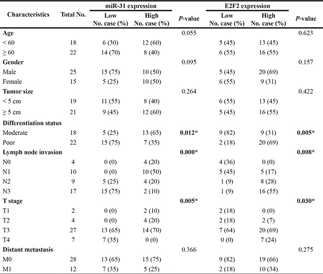 Table 1: Correlations between miR-31 and E2F2 expressions and clinical characteristics in patients with gastric cancer