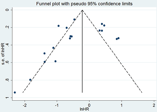 The pooled HRs of microRNA expression for OS, DFS, and RFS were calculated in this meta-analysis. A pooled HR < 1 means a poor prognosis for patients with low microRNA expression. In contrast, a pooled HR > 1 and a lower limit of the 95% CI of a pooled HR > 1 indicate a poor prognosis for patients with high microRNA expression [28]. Heterogeneity was assessed using a Q test and I2 statistic (P < 0.05 and/or I2 > 50% were considered statistically heterogeneous). If there was no obvious heterogeneity, a fixed-effects model was used; otherwise, the random-effects model was used. Publication bias was evaluated using the funnel plot and Egger’s test (values of P > 0.05 indicated lack of publication bias) [29]. All of the analyses were performed using STATA (version 12.0). For all the results, values of P < 0.05 were considered statistically significant.