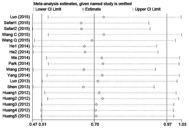 We systematically evaluated the methodological quality of all the included studies according to a critical review checklist from the Dutch Cochrane Centre proposed by the Meta-analysis of Observational Studies in Epidemiology [24]. The key points included: study population, country of the study, study design, outcome, cut-off value, microRNA detection method, and follow-up period. Each study was required to meet all of these points.