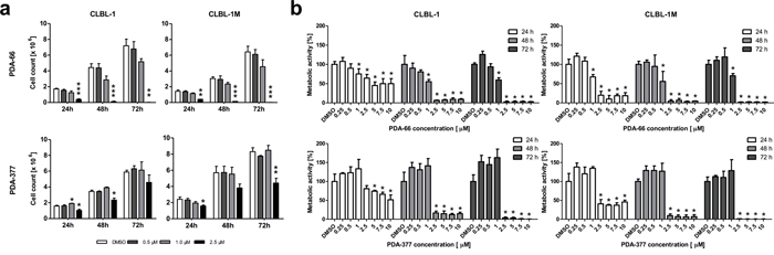 Figure 1: Exposure to PDA-66 and PDA-377 inhibits cell proliferation and metabolic activity in CLBL-1 and CLBL-1M. a. CLBL-1 and CLBL-1M cells were incubated with different concentrations of PDA-66 and PDA-377 for 24 h, 48 h and 72 h. The proliferation was suppressed significantly at the concentration of 2.5 μM. The diagrams show the mean ± SD of three independent counting experiments. Significance of a treatment effect compared to the DMSO control was determined using student’s t-test, p<0.05. b. CLBL-1 and CLBL-1M cells were incubated with different concentrations of PDA-66 and PDA-377 ranging from 0.25 μM to 10 μM and incubated for 24 h, 48 h and 72 h. Metabolic activity was determined using WST-1 assay. The results are expressed as percentage of the DMSO-treated cells. The diagrams show the mean ± SD of four independent measurements. Significance of a treatment effect compared to the DMSO control was determined using Dunnett’s Multiple Comparison Test with a p value of < 0.05. *: p<0.05; **: p<0.01; ***: p<0.001.