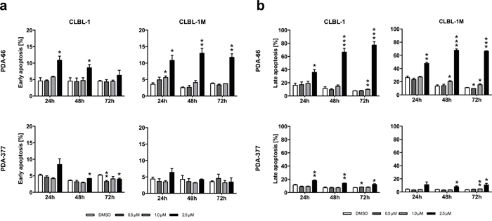 Figure 2: PDA-66 and PDA-377 induce apoptosis. CLBL-1 and CLBL-1M cells were exposed to 0.5 μM, 1.0 μM and 2.5 μM PDA-66 and PDA-377 for 24 h, 48 h and 72 h. Analysis of early apoptosis and late apoptosis was performed using flow cytometry after Annexin V FITC and propidium iodide (PI) staining. As a reference DMSO treated cells were analyzed. Rates of early apoptotic (FITC+, PI-) and late apoptotic/dead (FITC+, PI+) cells were determined and displayed as the mean ± SD of three independent measurements. a. Rate of early apoptotic cells after 24 h, 48 h and 72 h. b. Rate of late apoptotic/dead cells after 24 h, 48 h and 72 h. Significance of a treatment effect compared to the DMSO control was determined using student’s t-Test, p<0.05. *: p<0.05; **: p<0.01; ***: p<0.001.
