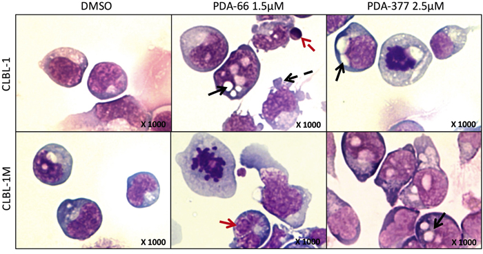 Figure 3: The morphological changes after PDA-66 and PDA-377 treatment. CLBL-1 and CLBL-1M cells were incubated with 1.5 μM PDA-66, 2.5 μM PDA-377 and DMSO. Cytospins of treated cells were stained with Pappenheim method after 72 h. Representative pictures are displayed. In DMSO controls, lymphoid round cells show moderately abundant light to dark blue cytoplasm with distinct clear Golgi zones and sometimes distinct vacuolization. The nuclei are single round, indent to cloverleaf-shaped showing coarse chromatin and round eccentric 1-5 nucleoli. In the cells exposed to PDA agents, cells are round to pleomorphic with light to dark blue abundant cytoplasm showing distinct Golgi zones and distinct large vacuolization. Nuclei of round to indent and cloverleaf-shaped (red solid arrow) present with clumped condensed chromatin pattern and rare eccentric round 1-3 nucleoli. Additionally, apoptotic bodies (red dashed arrow), cytoplasmic blebbing (black dashed arrow), increased cytoplasmic and nuclear vacuolization (black solid arrows) and mitotic figures could be observed in analyzed cells.