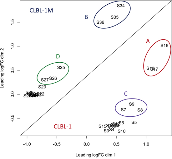 Figure 4: The MDS plot of the RNA-seq data. The distances correspond to the differences in the biological coefficient of variation between the samples. The analyzed cells were treated with 1.0 μM and 2.5 μM PDA-66 and DMSO respectively for 12 h and 24 h. Four distinct clusters were observed in MDS plot. The biological replicates form close clusters. Cluster A: High-dose (2.5 μM) 24 h treatment CLBL-1; Cluster B: High-dose (2.5 μM) 24 h treatment CLBL-1M; Cluster C: High-dose (2.5 μM) 12 h treatment CLBL-1; Cluster D: High-dose (2.5 μM) 12 h treatment CLBL-1M. S (1-36): Sample names of PDA-66 and DMSO-treated cells.