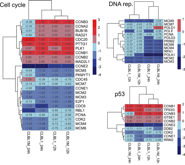 The early effects (12 h) of PDA-66 involved deregulation of 170 genes in CLBL-1 cells and 235 genes in CLBL-1M cells. Both 12h.high-dose treatment groups showed highly significant enrichment of genes mapping to the KEGG pathways: cell cycle, DNA replication and p53 signaling (Table 4). The fold-changes of the early affected genes in these pathways are displayed as heatmaps for all four high-dose treatment groups in Figure 5 and show consistent directions of changes in the 12 h treatment groups. An overview of this drug-induced gene regulation in the context of the mammalian cell cycle is displayed in Figure 6. The results of the transcriptome analysis suggest a cell cycle arrest putatively in late M-phase, likely involving the spindle assembly checkpoint.