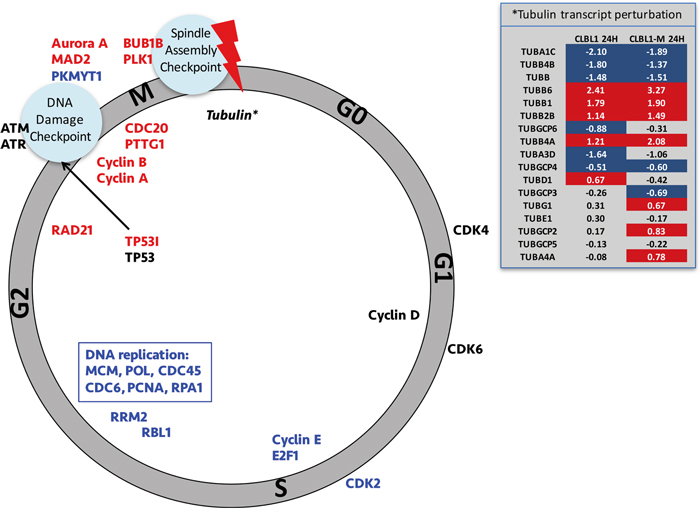 Figure 6: Schematic overview of the PDA-66 effect on cell cycle. Schematic overview of the PDA-66 effect on cell cycle-related gene expression. Genes printed in blue are downregulated and genes printed in red are upregulated. Cell cycle-related kinases are printed on the outside of the circle. Genes that are expressed during the G2 phase of the cell cycle are upregulated in the PDA-66 cell cultures as compared to controls, while G1 and S-phase associated genes are significantly downregulated. The expression pattern together with the perturbation in tubulin isoform transcript abundance (insert) suggests activation of the spindle assembly checkpoint (red bolt). Insert: Tubulin isoforms and associated complexes are listed and log-fold changes are given for the two cell lines after 24 h treatment with 2.5 μM PDA-66. Values highlighted in red or blue indicate significant higher or lower abundances, respectively. Greyed values are non-significant changes (FDR>0.05).